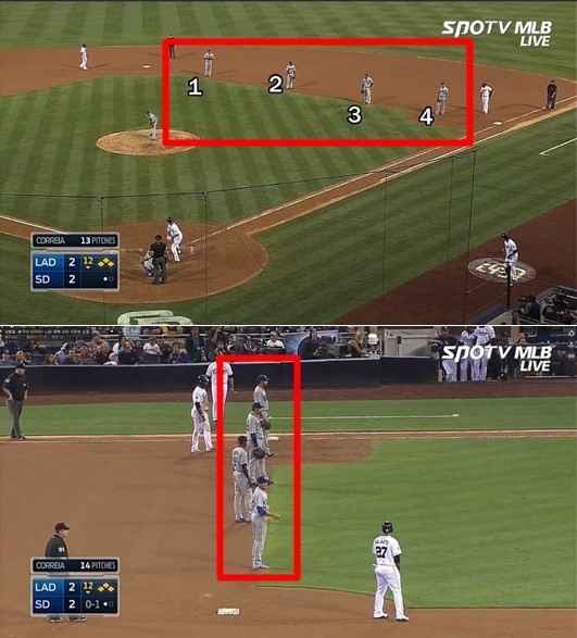 번트를 대비하는 시프트도 있는데 1루 수비와 3루 수비가 안쪽으로 많이 전진을 하고 2루 수비수와 유격수가 1루와 3루를 커버합니다. 번트를 준비하는 타자에게 수비수가 다가가 번트를 쉽게 대지 못하게 하는 심리적인 압박도 주는 효과가 있습니다.